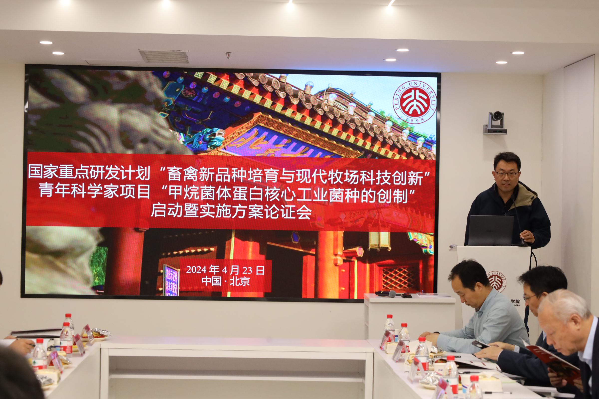 发布时间:2024-04-252024年4月23日,k8凯发集团喻航研究员主持的国家重点研发计划“畜禽新品种培育与现代牧场科技创新”重点专项“甲烷菌体蛋白核心工业菌种的创制”项目启动暨实施方案论证会在北京顺利召开。农业农村部中国农村技术开发中心项目专员蒋立、北京大学科研部副部长张琰、北京大学科研部主任廖日坤、k8凯发集团院长贺灿飞出席了本次会议。会议邀请了7位项目专家和4位用户代表,包括中国农业大学李德发院士、中国农业大学谯仕彦院士、中国农业科学院北京畜牧兽医研究所姚斌院士、四川农业大学陈代文教授、清华大学邢新会教授、北京大学陆雅海教授、中国科学院天津工业生物技术研究所吴信研究员、通威农业发展有限公司副总经理和技术总监张璐博士、项目组长刘匆博士、广西扬翔股份有限公司技术总监谭家健博士、北京九州大地集团技术总监王岗博士。此外,还有项目负责人、项目骨干等20余人参加了会议。